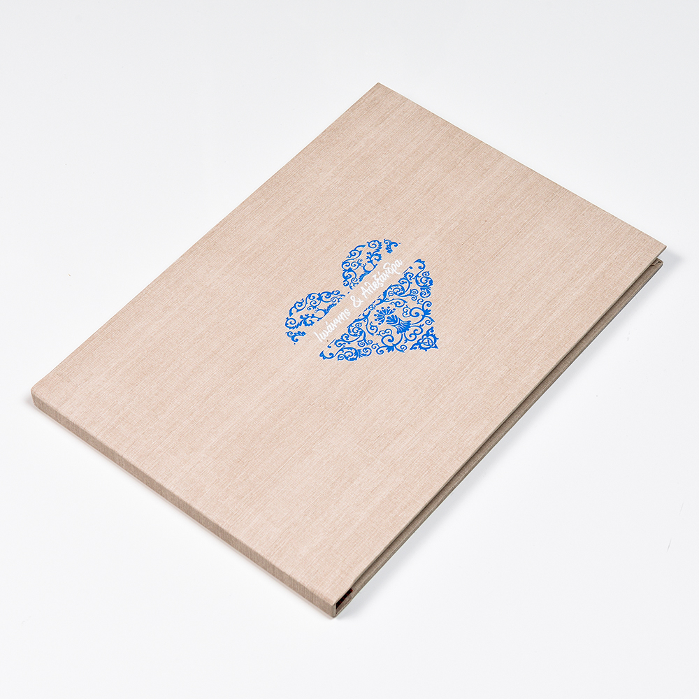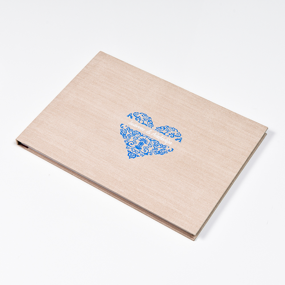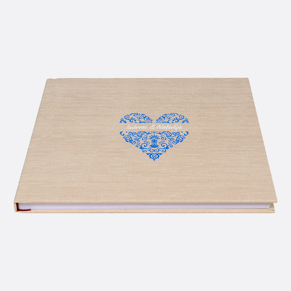 Ένα ιδιαίτερα κομψό ευχολόγιο με ενιαίο εξώφυλλο που φέρει ένα όμορφο ρομαντικό γραφιστικό σε συνδυασμό με τα ονόματα του ζευγαριού σε εκτύπωση UV.